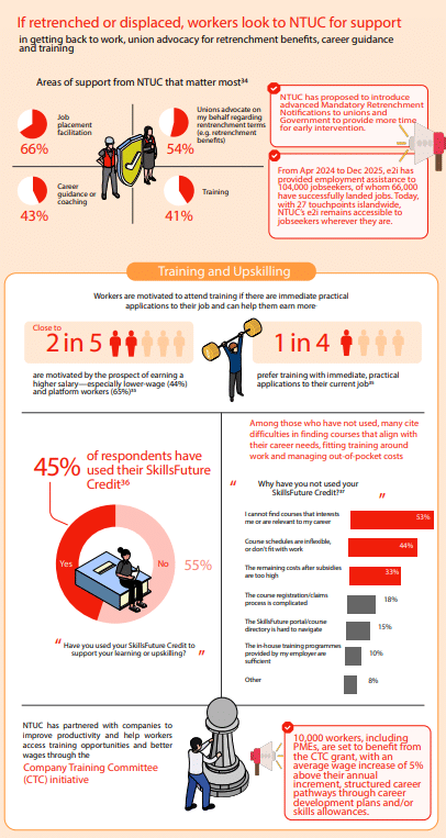 Despite these challenges, workers continue to look to NTUC for support, particularly in job placement, career guidance and training. The report notes that workers are most motivated to upskill when training is directly applicable to their jobs and linked to higher earning potential.