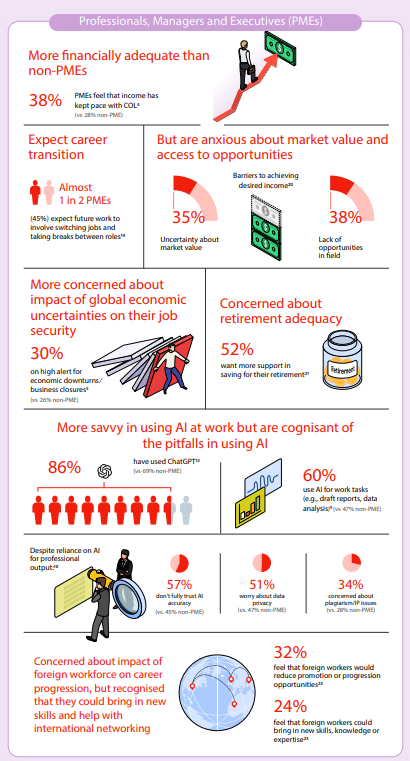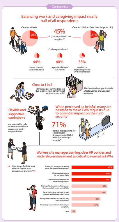 Caregiving responsibilities are adding another layer of complexity. Close to half of respondents reported challenges in balancing work and caregiving, with stress, burnout and unpredictable care needs frequently cited. Despite recognising the value of flexible work arrangements, many workers remain hesitant to request them due to fears of negative career impact.