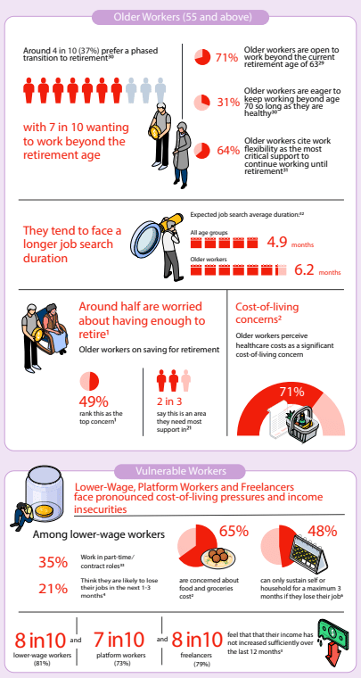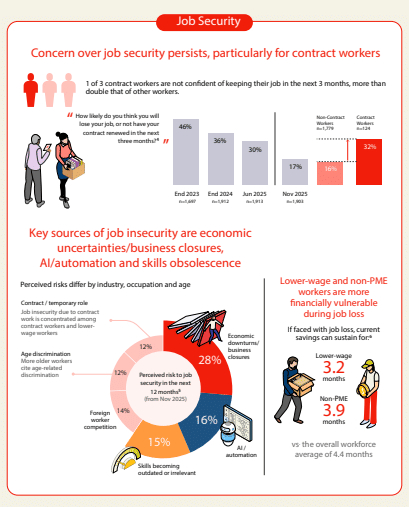 Job security remains another critical pressure point. Workers cited economic downturns, business closures, and the risk of skills becoming obsolete as leading threats. Contract workers, in particular, appear vulnerable, with one in three expressing low confidence about retaining their jobs in the near term, more than double the rate among non-contract workers.