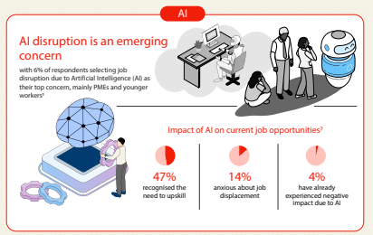 At the same time, artificial intelligence is emerging as both an opportunity and a source of unease. While only 6% of respondents identified AI disruption as their top concern, the sentiment is more pronounced among younger workers and professionals. Nearly one in three younger workers worry that AI could replace their current roles, even as many actively use AI tools at work.